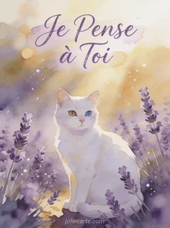Partagez cette image « Je Pense à Toi » pour un message sincÚre et touchant. Un chat blanc aux yeux vairons parmi les lavandes exprime toute la douceur de cette pensée qui vient du coeur.