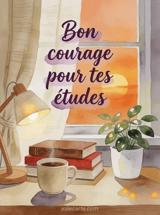 Souhaitez bon courage pour les études à un proche qui travaille dur pour réussir ses examens. Pour d'autres encouragements, découvrez un bon courage pour tes exams, un bon courage pour le BEM ou un bon courage pour le permis.