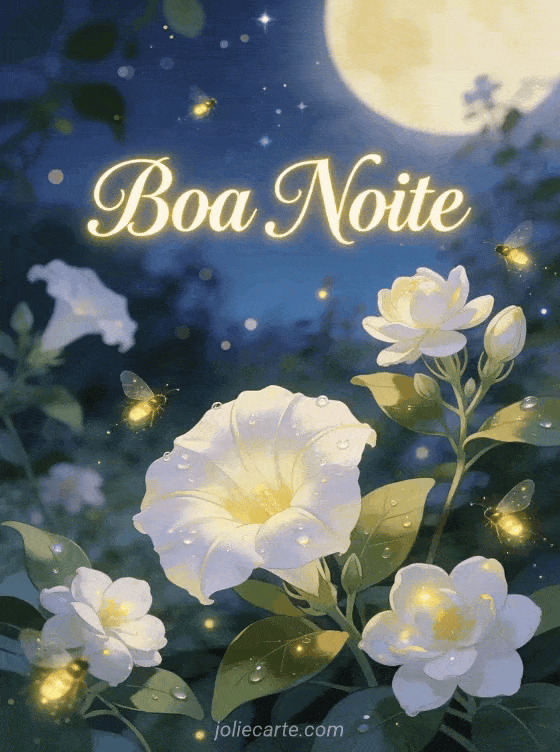 Boa Noite um sereno cartão de boa noite com flores ao luar e vagalumes