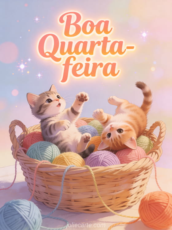 Alegre a quarta-feira de alguém com este adorável cartão Boa Quarta-feira com dois gatinhos brincalhões se divertindo em uma cesta de novelos de lã coloridos em uma alegre atmosfera pastel.