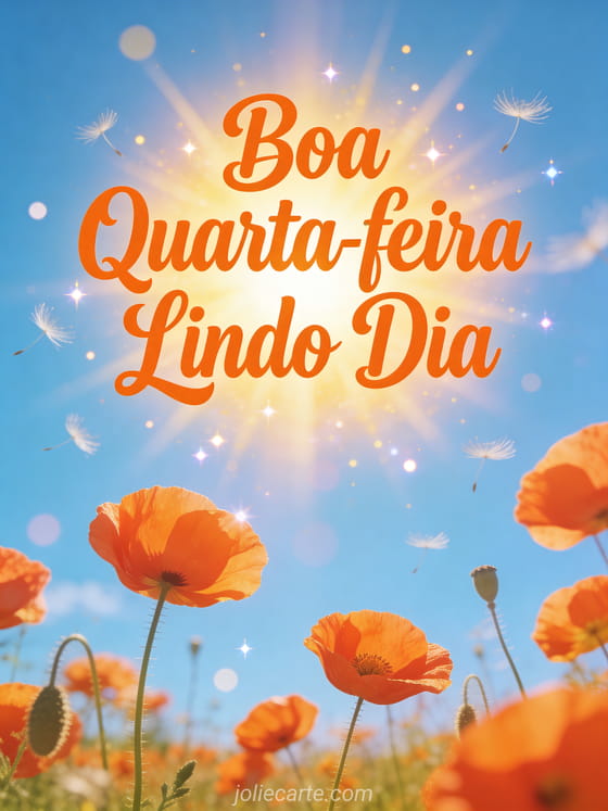 Deseje a alguém uma maravilhosa quarta-feira com este vibrante cartão Boa Quarta-feira Lindo Dia com um campo de papoulas laranjas sob um céu azul. Descubra também um cartão Boa Quarta Beijos, um cartão Olá Quarta-Feira ou um cartão Boa Quarta gatinhos.