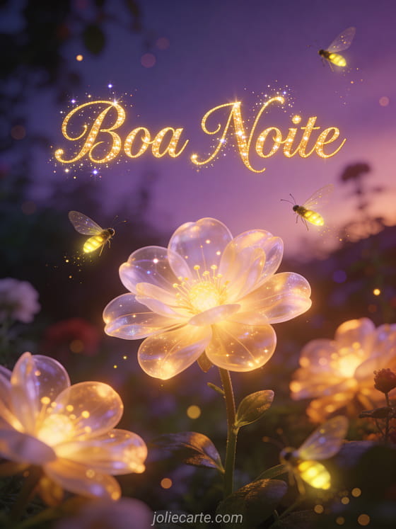 Envie um mágico cartão de boa noite com esta encantadora imagem. Um jardim crepuscular brilha com vaga-lumes e flores luminescentes em uma atmosfera quente de âmbar e roxo profundo. Descubra também um cartão de noite zen ou um cartão de boa noite.