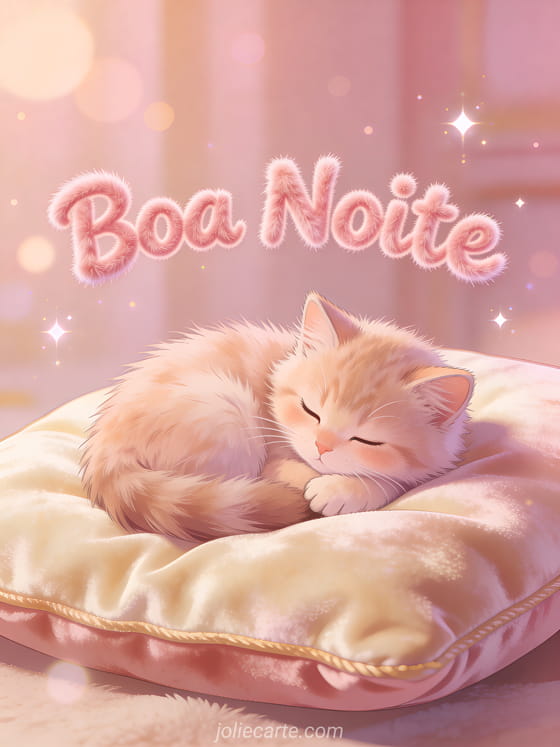 Envie um doce cartão de boa noite com esta adorável imagem. Um gatinho fofinho enrolado sobre uma almofada de veludo em uma atmosfera aconchegante em tons de rosa e creme, perfeito para desejar uma noite tranquila. Descubra também um cartão de noite com veleiro ou um cartão de noite mágica.