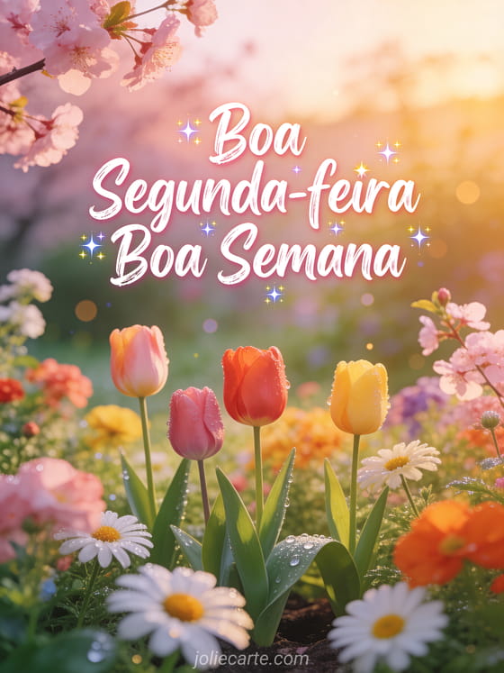 Comece a semana de alguém com alegria com este cartão de boa segunda-feira. Coloridas flores de primavera florescem em um jardim ao amanhecer, com uma fresca atmosfera matinal de orvalho e suave luz cintilante.