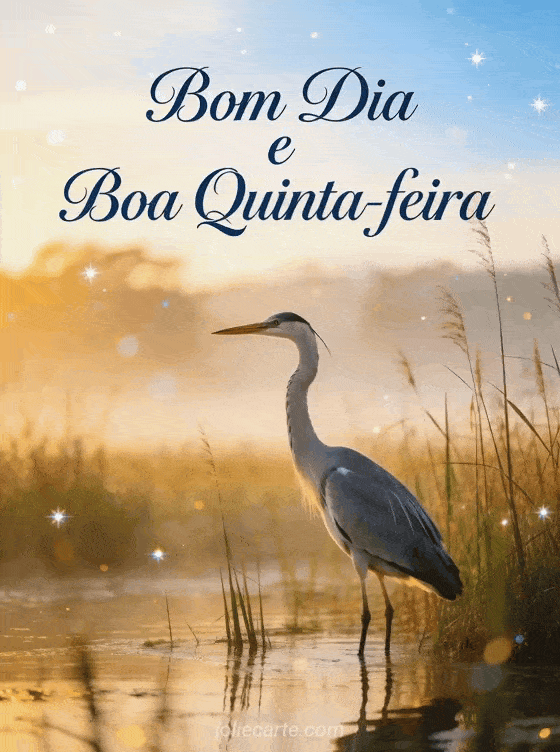 Comece sua quinta-feira com serenidade enviando este elegante cartão Bom Dia e Boa Quinta-feira com uma garça em águas rasas entre juncos ao nascer do sol. Descubra também um cartão Boa Quinta Ensolarada.