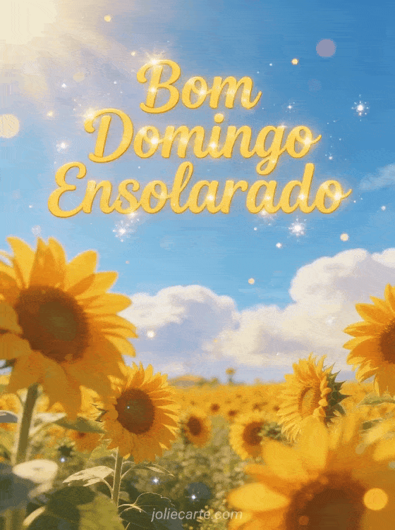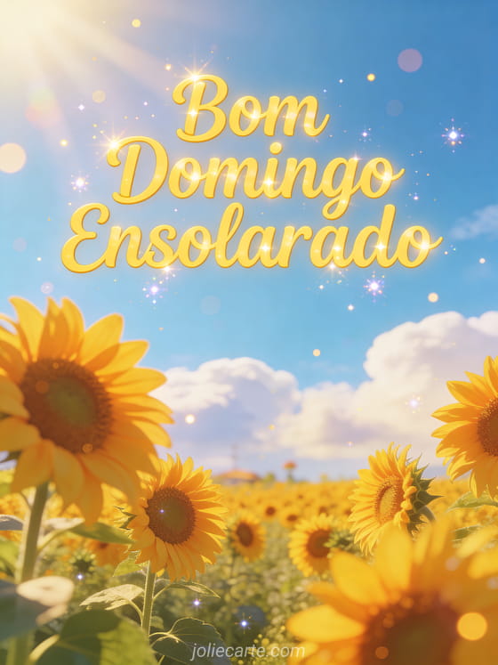 Envie uma radiante saudação de bom domingo ensolarado com este belo cartão. Um deslumbrante campo de girassóis sob um céu azul com nuvens fofas, banhado pela luz dourada do verão. Descubra também um cartão de domingo com café, um cartão de domingo com gatinhos ou um cartão de domingo com beijos.