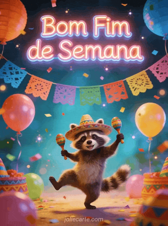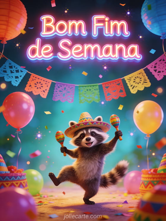 Envie um divertido cartão de bom fim de semana para começar com um sorriso. Um engraçado guaxinim dança com maracas cercado de coloridas decorações de festa e papel picado. Descubra também um cartão de fim de semana com jardim ou um cartão divertido de fim de semana.