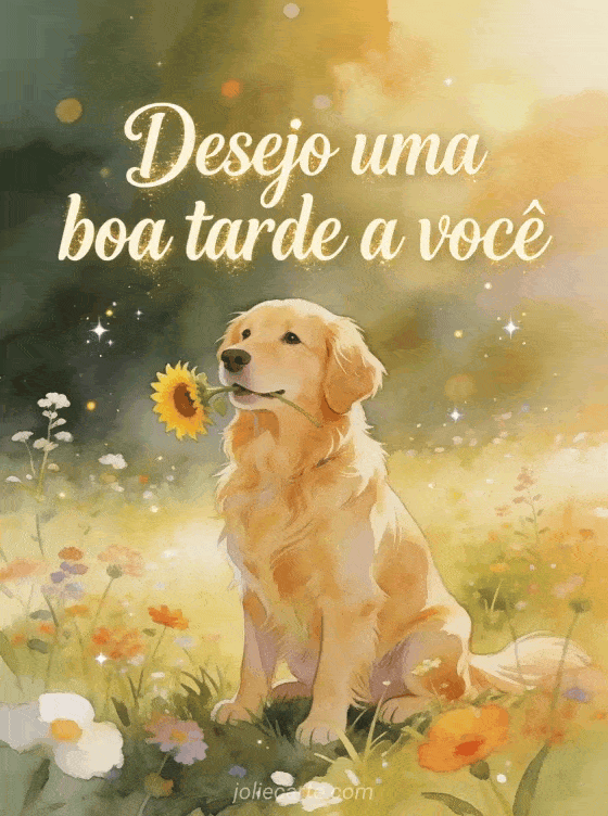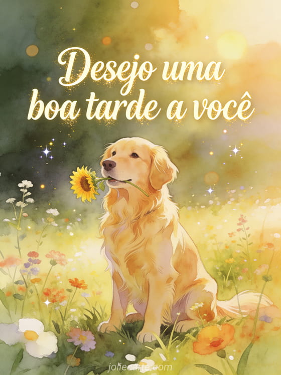 Envie uma bela saudação de boa tarde para alegrar o dia de alguém. Um encantador golden retriever sentado em uma campina ensolarada com flores silvestres, segurando um girassol na boca nesta ilustração em estilo aquarela.