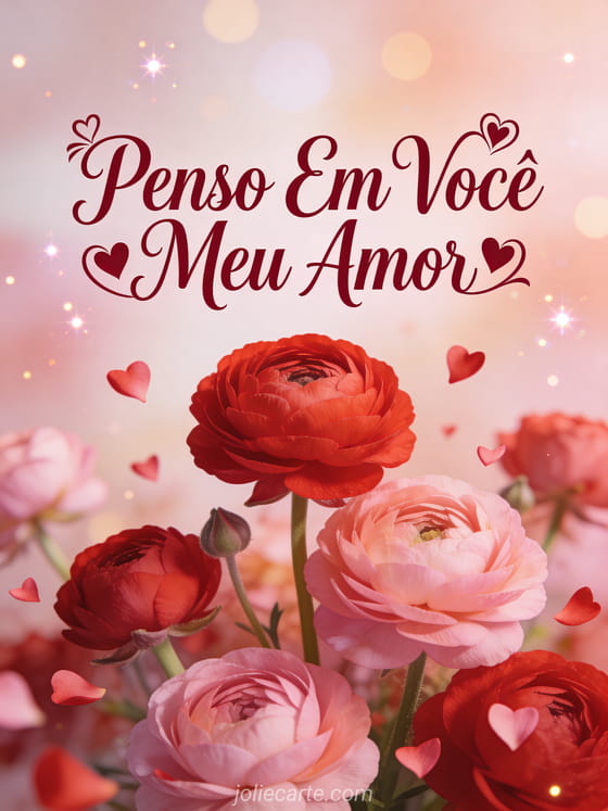 Envie este cartĂŁo romĂąntico com lindas flores de ranĂșnculo vermelhas e rosas com pĂ©talas em forma de coração. Descubra tambĂ©m um cartĂŁo com frase penso em vocĂȘ ou um cartĂŁo penso em vocĂȘ e sonho com vocĂȘ.