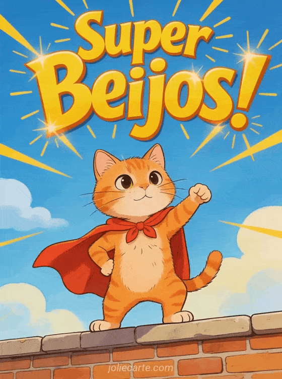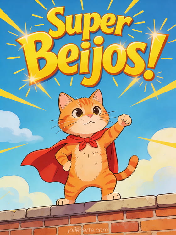 Envie um super beijos para alegrar o dia de alguém especial com este divertido cartão. Um gato ruivo com capa vermelha faz uma pose heroica sobre um muro sob um céu azul brilhante com nuvens. Descubra também um cartão preciso de beijos ou um cartão de beijos à distância.