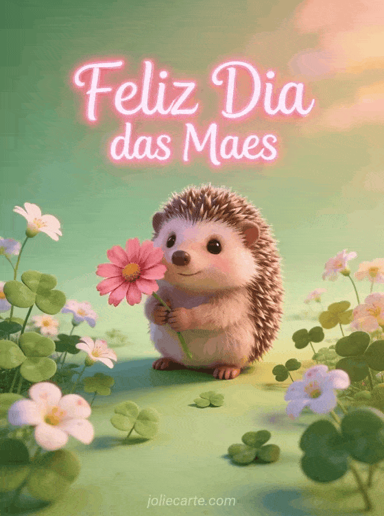 Celebre o Dia das Maes com este encantador cartao que mostra um adoravel ourico segurando uma flor de cosmos rosa. Rodeado de margaridas e trevos numa suave luz verde, esta linda ilustracao vai aquecer o coracao da sua mae. Descubra tambem um cartao com poema para mae ou um cartao com palavras doces para mae.