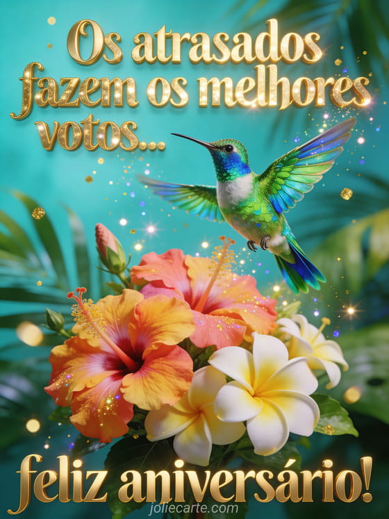 Envie esta colorida saudação de aniversário atrasado com um lindo beija-flor e flores tropicais para alegrar o dia de alguém. Descubra também um feliz aniversário atrasado com humor ou um SMS de aniversário atrasado ou um gif de aniversário atrasado.
