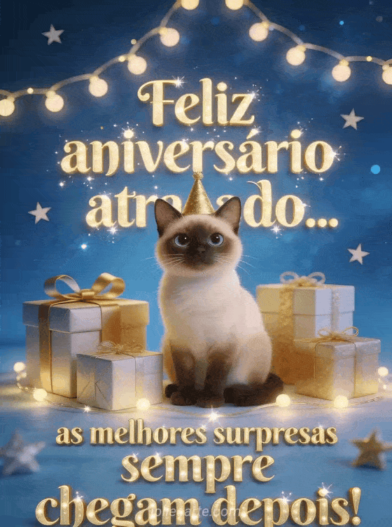 As melhores surpresas sempre chegam depois. Envie este alegre cartão de aniversário atrasado com um gato siamês, presentes e guirlandas. Descubra também um cartão de aniversário atrasado com flores ou um cartão de aniversário atrasado com gatinho.