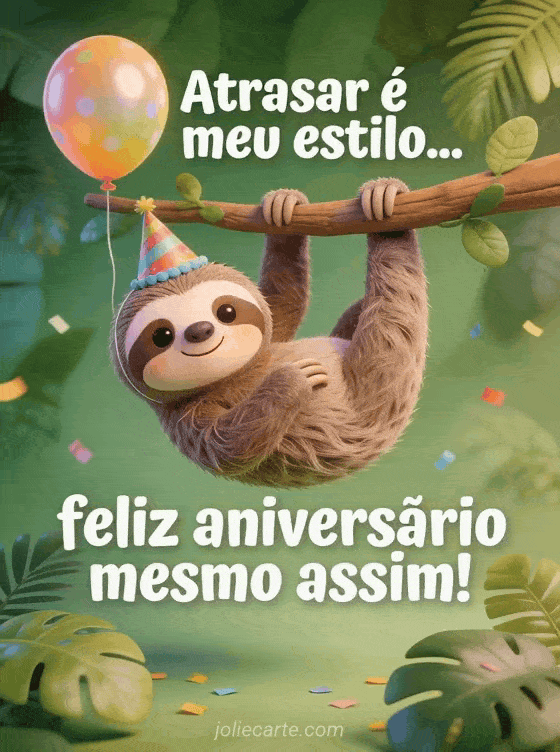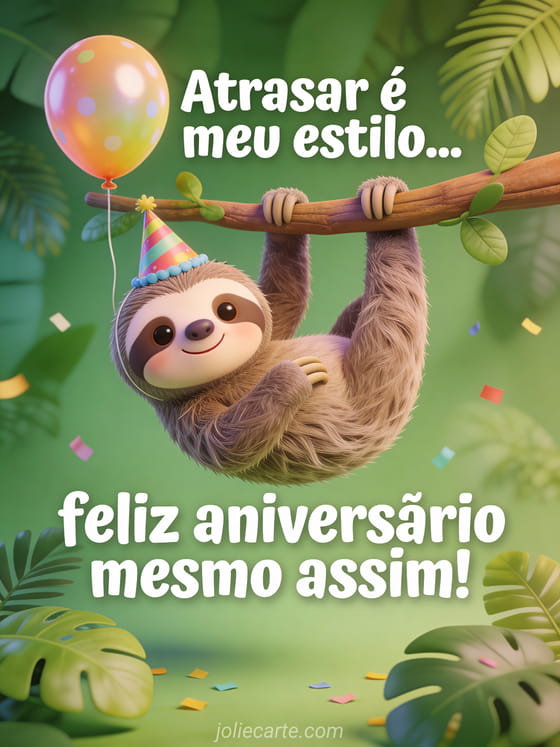 Atrasar é meu estilo. Envie este divertido cartão de aniversário atrasado com um alegre bicho-preguiça e balões. Descubra também um cartão de aniversário atrasado com cachorrinho ou um cartão de aniversário atrasado com gato.