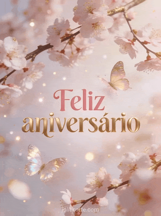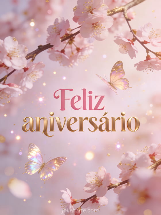 Envie um refinado e delicado feliz aniversário com borboletas iridescentes e cerejeiras em flor. Descubra também um cartão ramo aniversário mulher, um ecard aniversário mulher ou um gif aniversário mulher grátis.