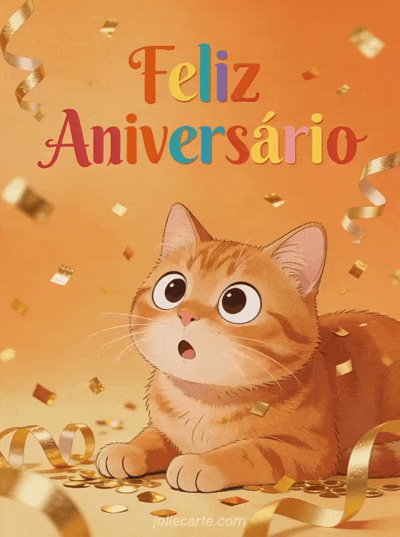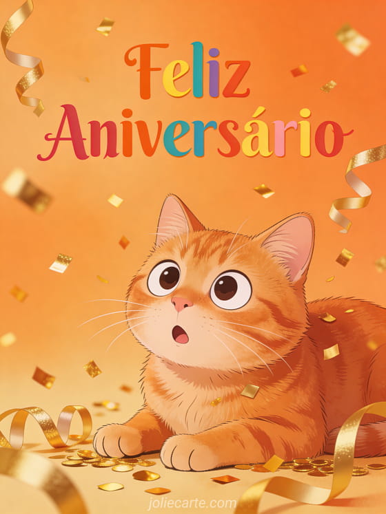Alegre o aniversário de alguém especial com este adorável cartão com um gato ruivo surpreso rodeado de confete dourado. Descubra também um cartão com frase de aniversário ou um cartão com buquê de flores.