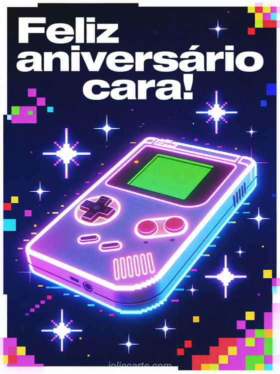 Envie esta saudação de aniversário gamer para celebrar o dia especial de um jogador com estilo neon. Descubra também um cartão de aniversário para garoto adolescente ou um feliz aniversário para adolescente ou uma mensagem de aniversário para adolescente.