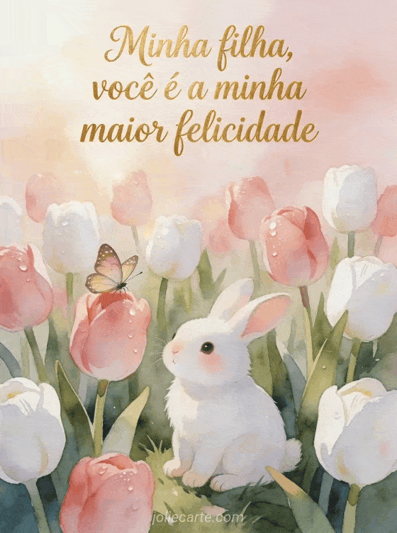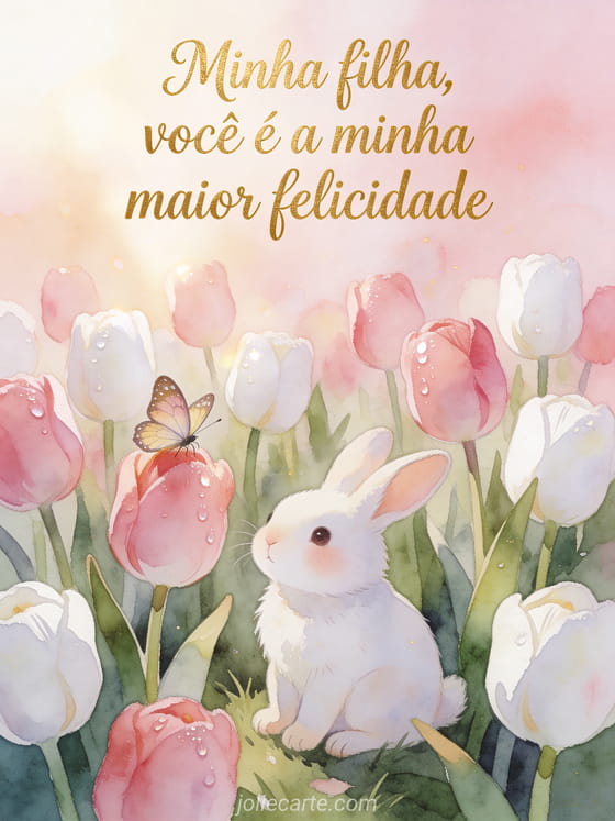 Celebre o aniversário da sua filha com este adorável cartão em aquarela com um coelho branco entre tulipas rosas e uma borboleta. Descubra também um cartão de aniversário para filha da mãe ou um cartão de feliz aniversário minha filha.