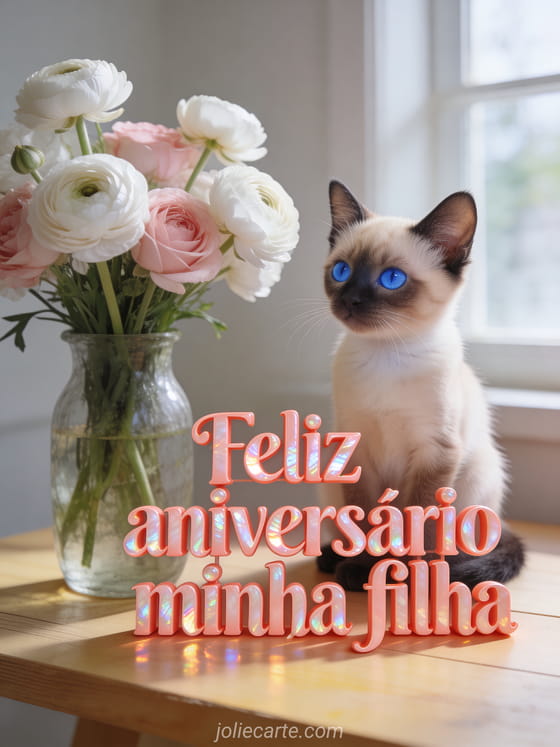 Celebre o aniversário da sua filha com este lindo cartão fotorrealista com um adorável gatinho siamês de olhos azuis ao lado de um vaso de ranúnculos rosas e brancos. Descubra também um cartão divertido de aniversário para filha ou um cartão de aniversário para filha com amor.
