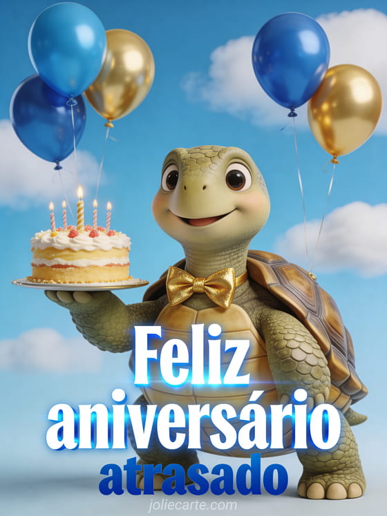Envie esta saudação divertida de aniversário atrasado com uma adorável tartaruga carregando um bolo de aniversário para mostrar que seus votos valem a espera. Descubra também uma saudação colorida de aniversário atrasado ou um aniversário atrasado engraçado ou um SMS de aniversário atrasado.
