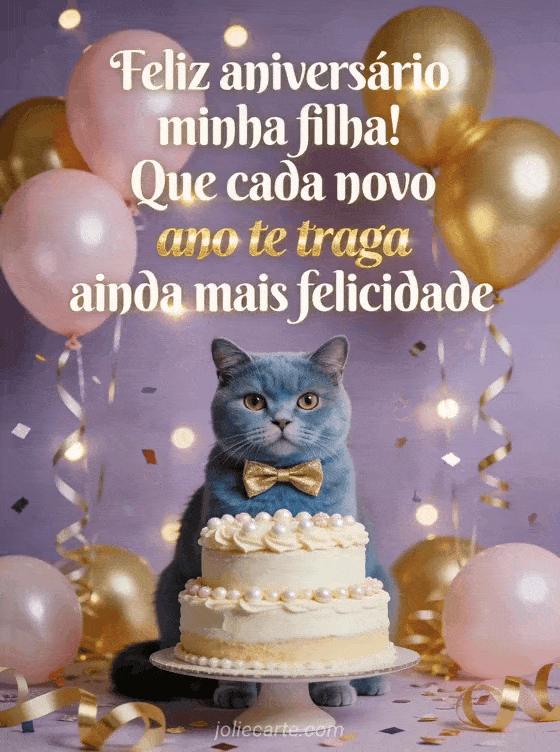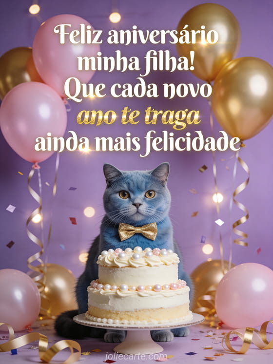 Que cada novo ano te traga ainda mais felicidade. Envie este alegre cartão de aniversário para sua filha com um gato British Shorthair, bolo e balões. Descubra também um cartão de aniversário para filha adulta ou um cartão poema de aniversário para filha.