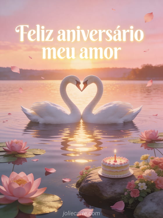 Celebre o aniversario da pessoa que voce ama com este lindo cartao gratuito. Dois cisnes brancos formando um coracao sobre um lago ao por do sol com reflexos dourados, nenufares rosas e um bolo de aniversario. Descubra tambem um cartao de aniversario romantico ou um cartao de feliz aniversario meu amor ou um cartao de aniversario para meu amor.