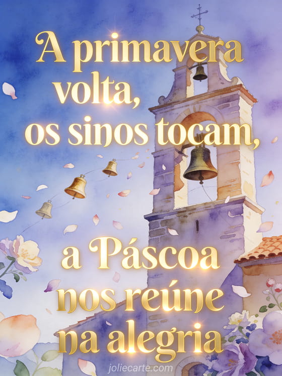 Partilhe esta alegre saudacao de Pascoa com um campanario de aldeia provencal em aguarela com sinos em voo rodeados de petalas de flores sob um ceu azul lavanda. Descubra tambem um cartao de ovos de Pascoa ou um cartao de texto de Pascoa.
