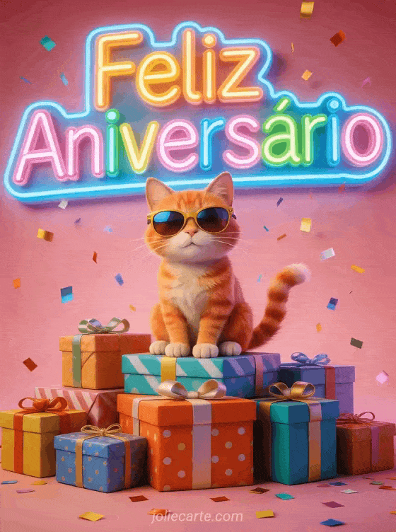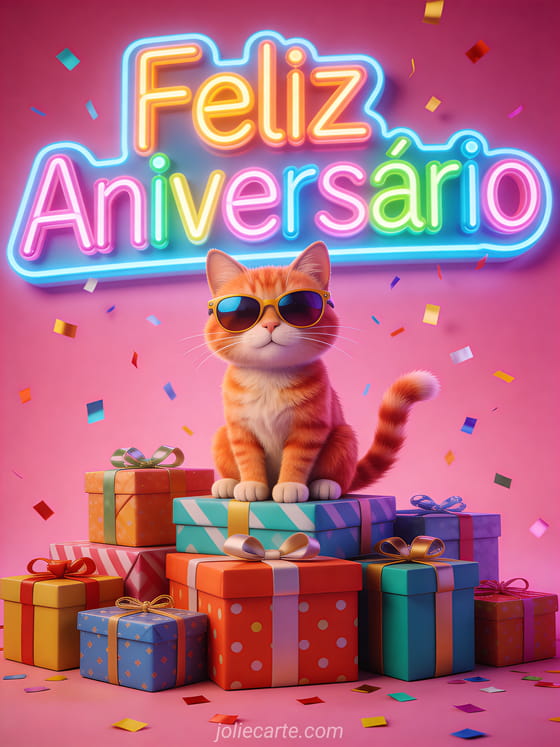 Envia este festivo cartão de aniversário com um gato ruivo de óculos de sol sentado em presentes embrulhados com luzes neon e confete. Descobre também um cartão divertido aniversário com lontra ou um cartão glamoroso aniversário gato.