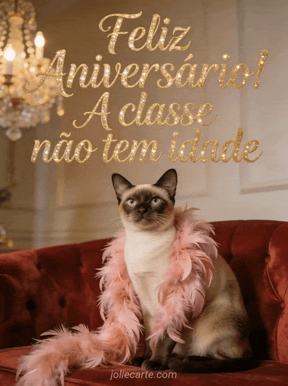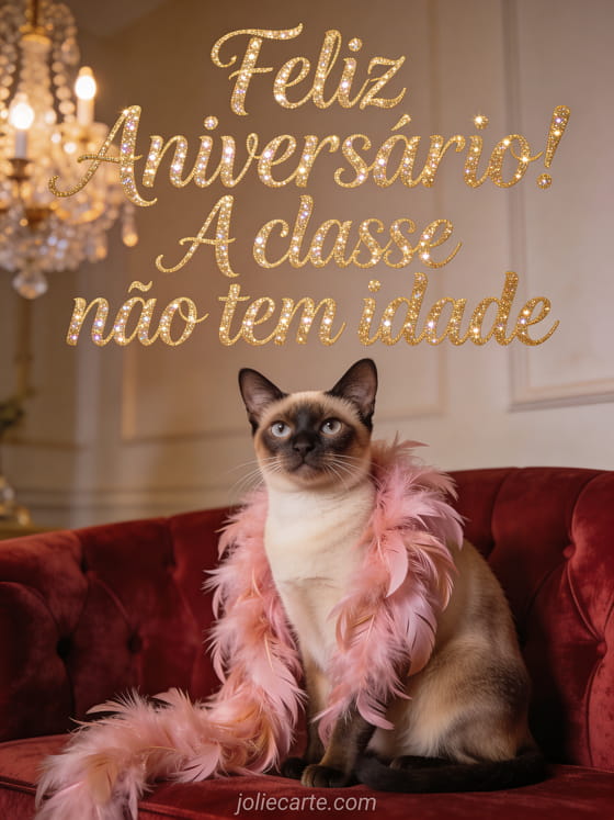 Envia este glamoroso cartão de aniversário com um fabuloso gato siamês com boa de penas rosas num sofá de veludo vermelho. Descobre também um cartão aniversário divertido mulher ou um imagem divertida aniversário.