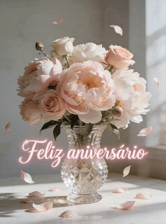 Envie este encantador cartao de feliz aniversario com um magnifico buque de peonias e rosas em um vaso de cristal, com petalas que caem suavemente, banhado em luz natural delicada. Descubra tambem um cartao animado de aniversario com fogos de artificio ou um cartao animado de aniversario.