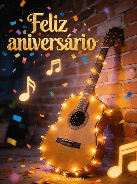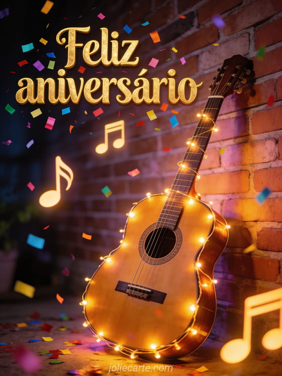 Envie este alegre cartao de feliz aniversario com letras douradas e confete colorido, uma guitarra acustica adornada com luzes decorativas contra uma parede de tijolos, e notas musicais luminosas flutuando no ar. Descubra tambem um cartao animado de aniversario com caixa de musica ou um cartao animado de aniversario com flores.