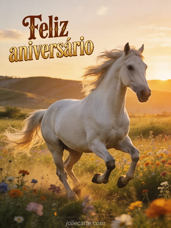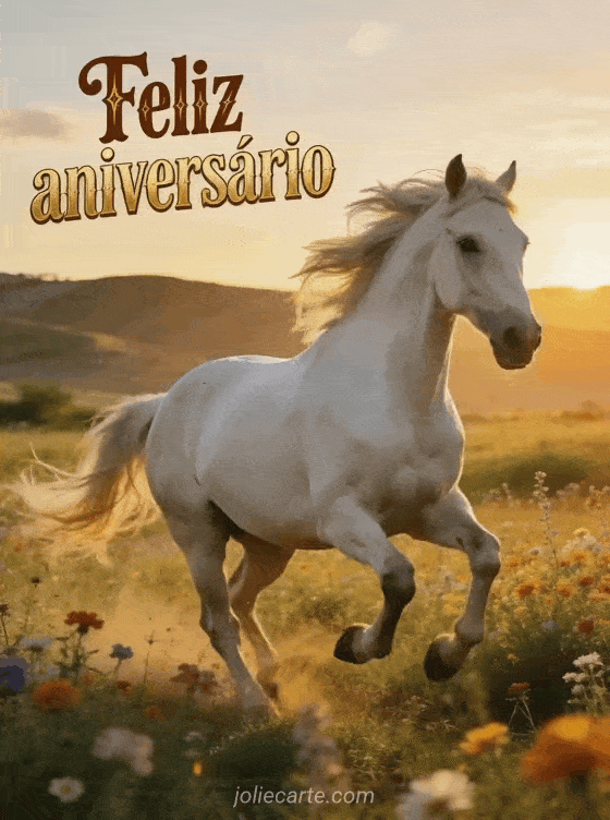 Envie um espetacular feliz aniversário com um majestoso cavalo galopando ao pôr do sol para celebrar o dia especial de alguém. Descubra também um gif animado de aniversário grátis ou um gif de aniversário com flores.