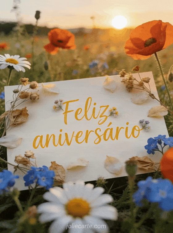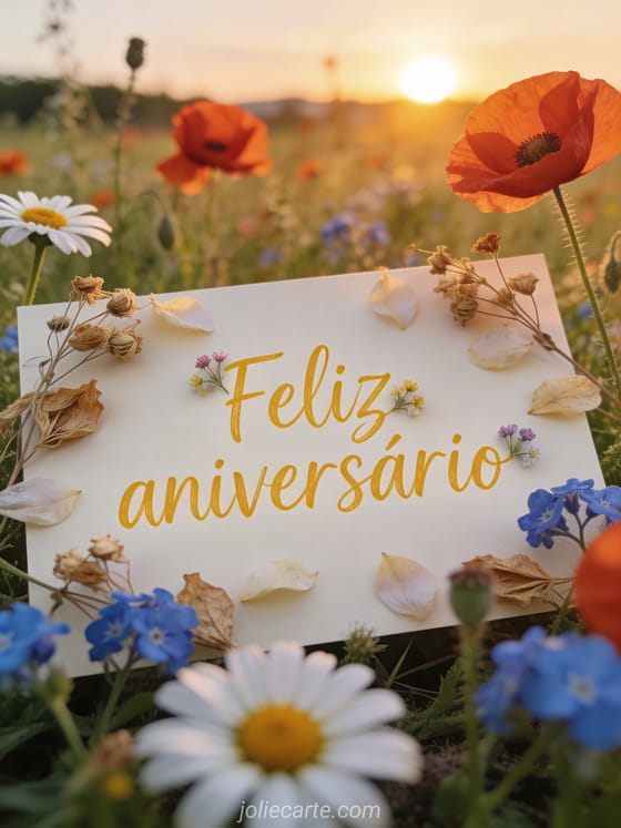 Comemore um aniversário especial com este lindo cartão com um campo de flores silvestres ao pôr do sol. Descubra também uma imagem grátis de aniversário ou um cartão com frases de aniversário.
