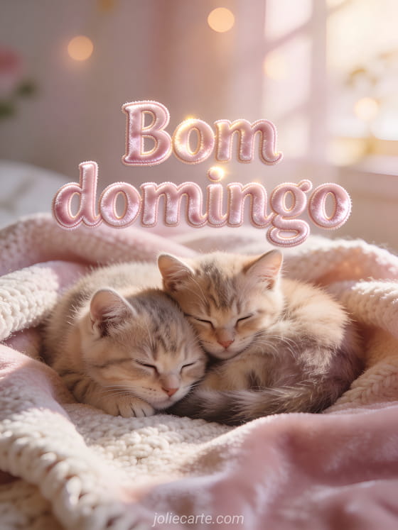 Envie uma terna saudação de bom domingo com este encantador cartão. Dois adoráveis gatinhos aconchegados em uma manta de lã sob uma luz quente de fim de tarde, uma cena fotorrealista de pura ternura. Descubra também um cartão de domingo com ouriço e beijos.