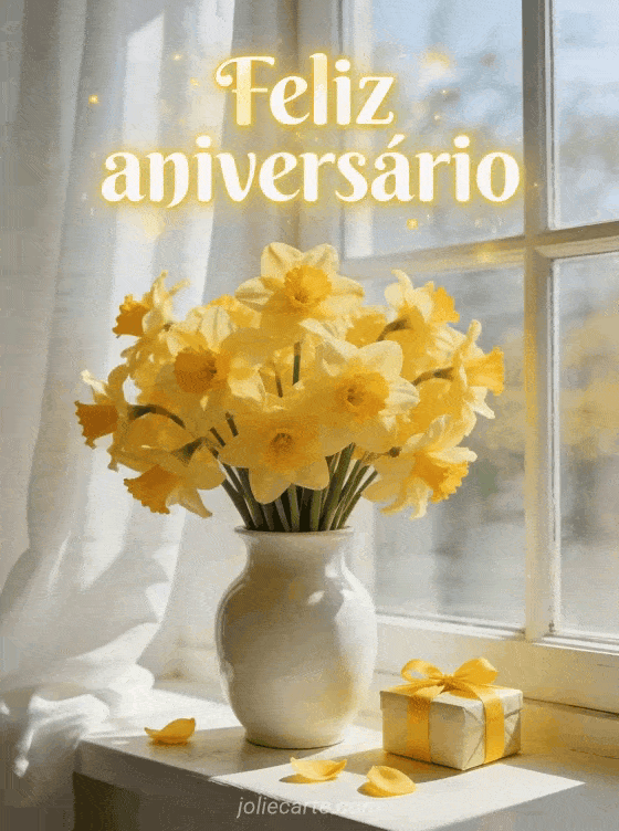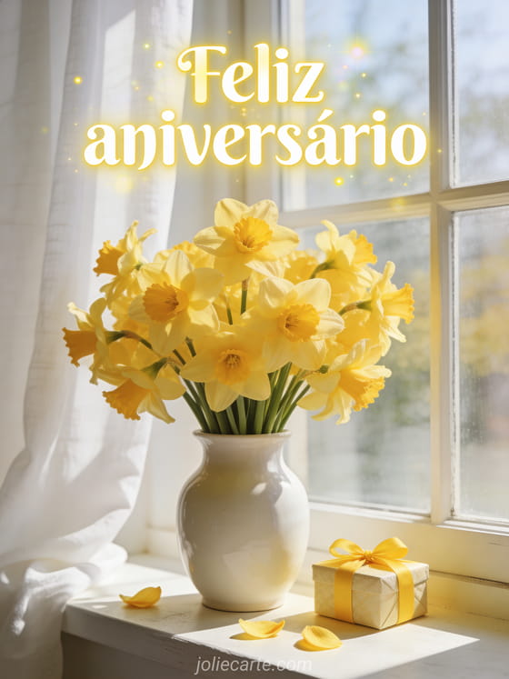 Celebre um aniversário com este luminoso cartão primaveril com um magnífico buquê de narcisos amarelos em um vaso branco junto a uma janela ensolarada e um pequeno presente com fita amarela. Descubra também um cartão de aniversário com gato ou um cartão de aniversário com fogos de artifício.