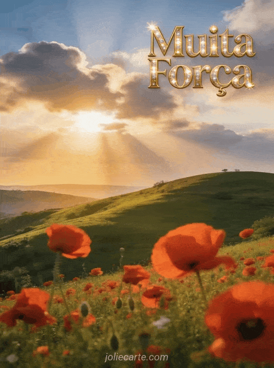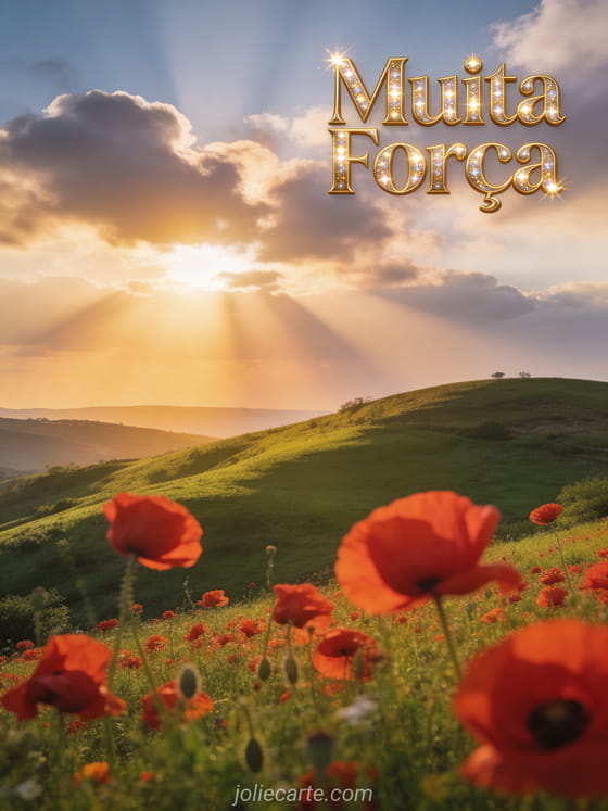 Envie este lindo cartao de coragem com um espetacular nascer do sol sobre colinas verdes e papoulas vermelhas para animar alguem. Descubra tambem um cartao de muita forca para mais mensagens calorosas de apoio.