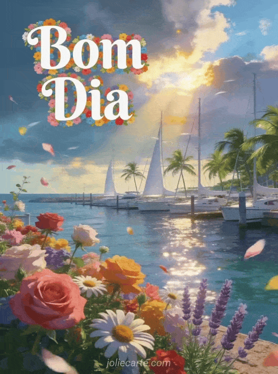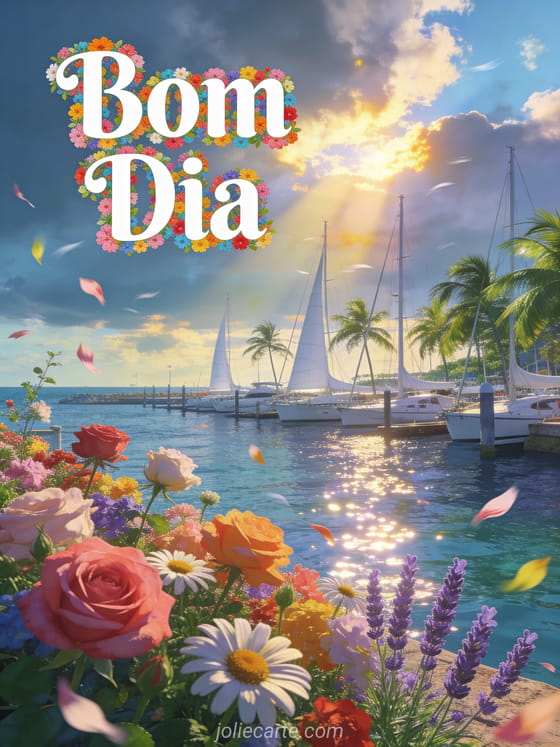 Envie um alegre Bom Dia com uma linda marina ensolarada, veleiros brancos e flores coloridas. Descubra também um cartao Bom Dia ou um cartao Bom Dia com beijos.
