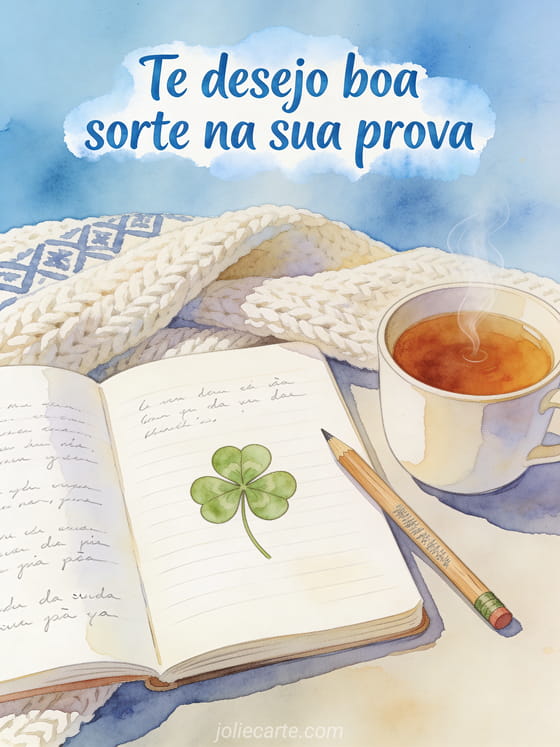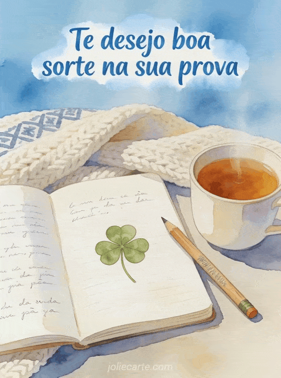 Envie um sincero desejo de boa sorte para uma prova com este cartao aconchegante com um caderno e um trevo de quatro folhas. Descubra também um gif de boa sorte para prova ou um cartao de desejos para prova.