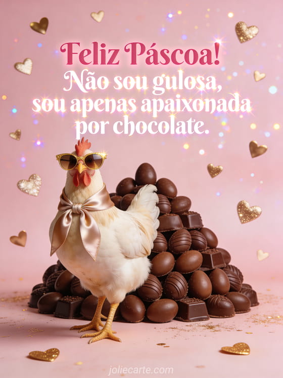Partilhe esta divertida saudacao de Pascoa com uma galinha glamorosa com oculos de sol dourados a posar frente a ovos de chocolate sobre fundo rosa em po. Descubra tambem um cartao de fim de semana de Pascoa com humor ou um cartao engracado de festas de Pascoa.