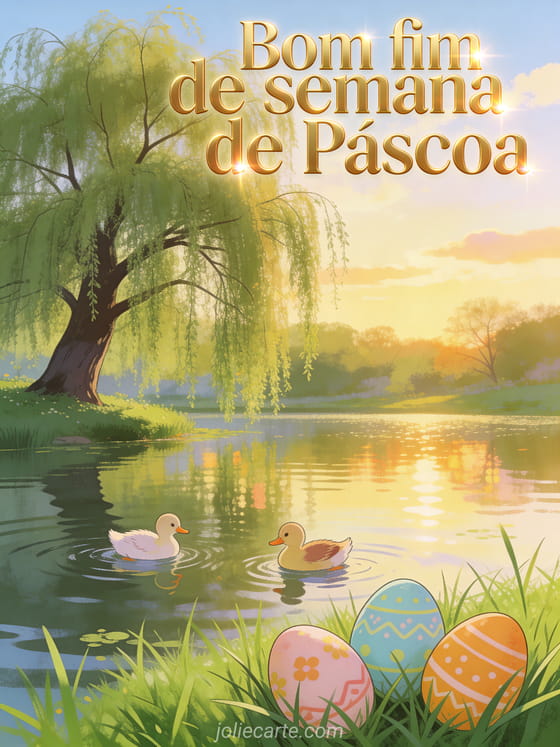 Partilhe esta serena saudacao de fim de semana de Pascoa com um salgueiro junto a um lago com patos e ovos de Pascoa coloridos na relva verde sob a luz dourada da tarde. Descubra tambem um cartao de bom fim de semana de Pascoa a todos.