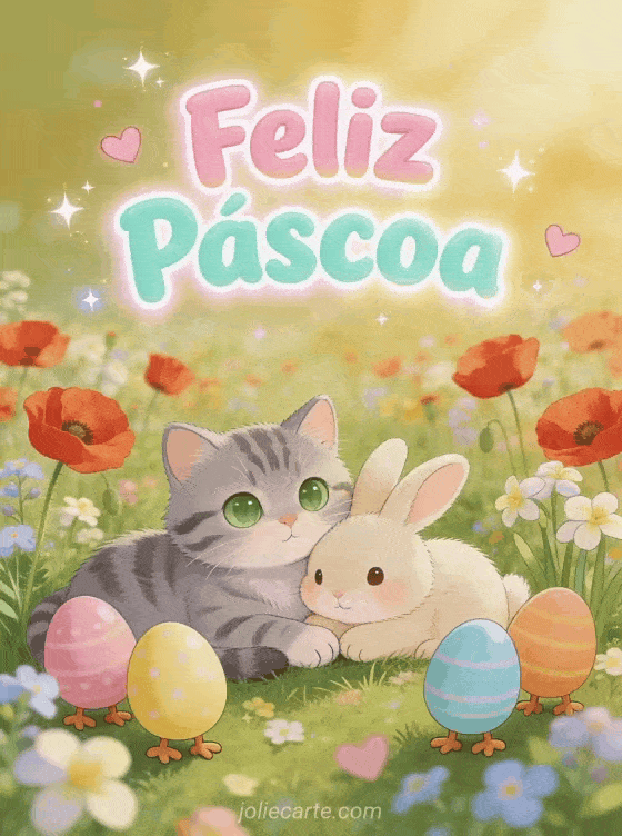 Encante os pequenos com este adorável cartão de Feliz Páscoa com um gatinho rajado e um coelhinho abraçados num campo de papoulas e margaridas, cercados por ovos de Páscoa coloridos. Uma ilustração kawaii cheia de alegria e ternura. Descubra também um cartão de animais de Páscoa ou um cartão com vídeo do coelhinho de Páscoa.