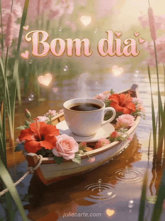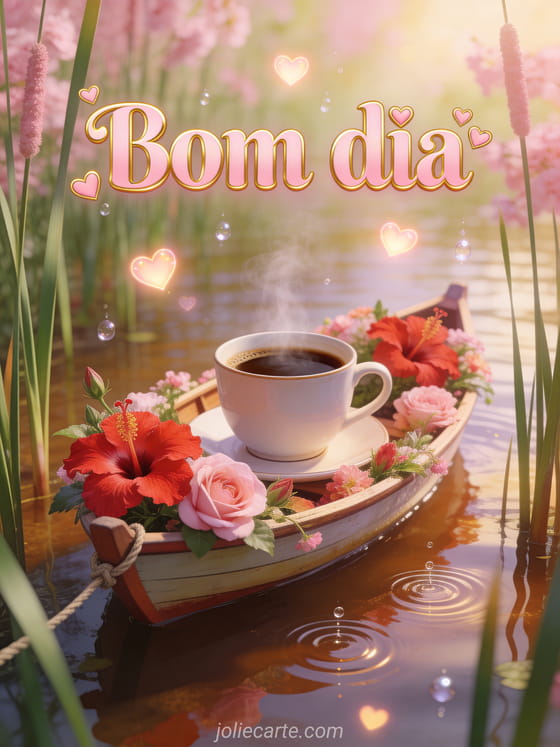 Envie um caloroso bom dia com este cartão poético de café. Uma xícara de café fumegante repousa em um barco cheio de flores ancorado entre os juncos, com vibrantes hibiscos vermelhos e rosas, uma garoa suave de primavera criando pequenos círculos na água e corações luminosos flutuando acima. Descubra também um cartão de café à beira-mar, um cartão de bom dia com café e beijos ou um cartão de saudades.