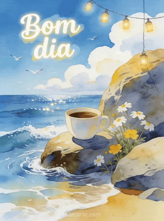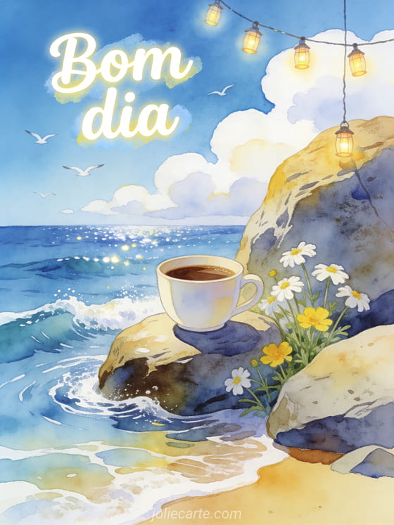 Comece o dia com uma brisa fresca enviando este cartão de bom dia com café. Uma xícara de café repousa sobre uma rocha lisa à beira-mar com ondas suaves, margaridas brancas e amarelas entre as rochas, gaivotas voando ao longe e lanternas cintilantes. Descubra também um cartão de bom dia com café e beijos ou um cartão de saudades.