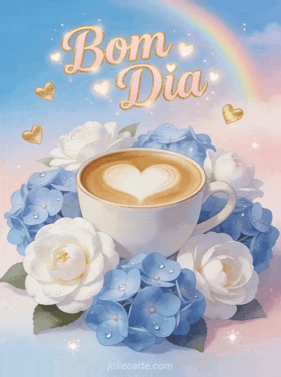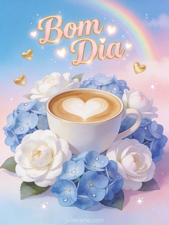 Comece o dia com este romântico cartão com uma xícara de café latte art em forma de coração rodeada de camélias brancas e hortênsias azuis, um arco-íris pastel e corações dourados flutuando. Descubra também uma imagem de café bom dia ou um cartão de bom dia café com coração.