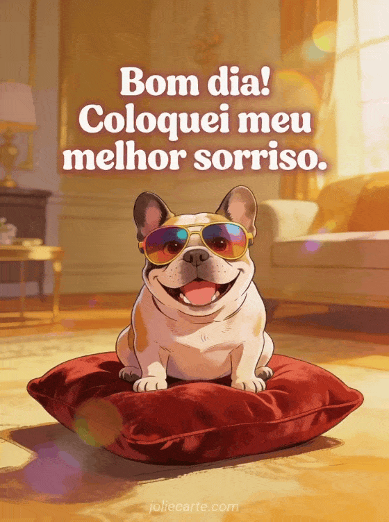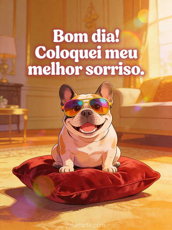 Alegre a manhã de alguém com este cartão engraçado de bom dia. Um bulldog francês está sentado orgulhosamente sobre uma almofada de veludo vermelho com enormes óculos de sol coloridos e um sorriso exagerado. Descubra também um cartão engraçado de bom dia no autopilot, um cartão de café matinal com humor ou um cartão de bom dia divertido.