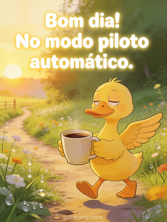 Comece o dia com um sorriso enviando este cartão engraçado de bom dia. Um pato amarelo caminha meio adormecido segurando uma enorme xícara de café, capturando perfeitamente o modo piloto automático da manhã. Descubra também um cartão engraçado de café pela manhã ou um cartão de bom dia com humor.