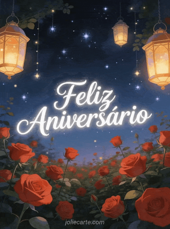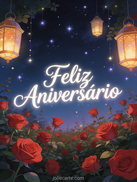 Deseje um feliz aniversário com este cartão de conto de fadas com um jardim de rosas vermelhas e lanternas suspensas sob estrelas cintilantes. Descubra também um cartão de aniversário com lavanda ou um cartão de aniversário com coração de rosas.