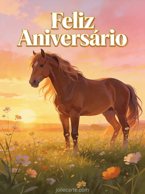 Deseje um feliz aniversário com este cartão poético com um majestoso cavalo marrom em uma campina de flores silvestres ao pôr do sol dourado. Descubra também um cartão de aniversário costeiro para ela ou um cartão vintage de aniversário para ela.
