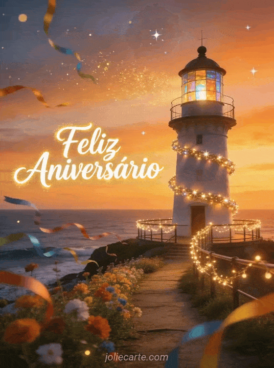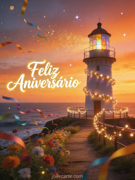 Deseje um feliz aniversário com este cartão costeiro caloroso com um farol ao crepúsculo envolto em luzes festivas e flores silvestres coloridas. Descubra também um cartão vintage de aniversário para ela ou um cartão de aniversário com champagne.