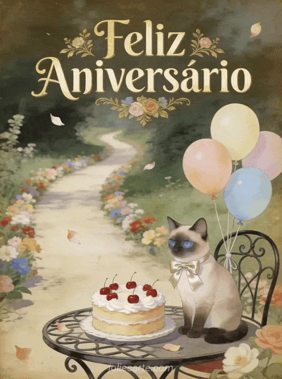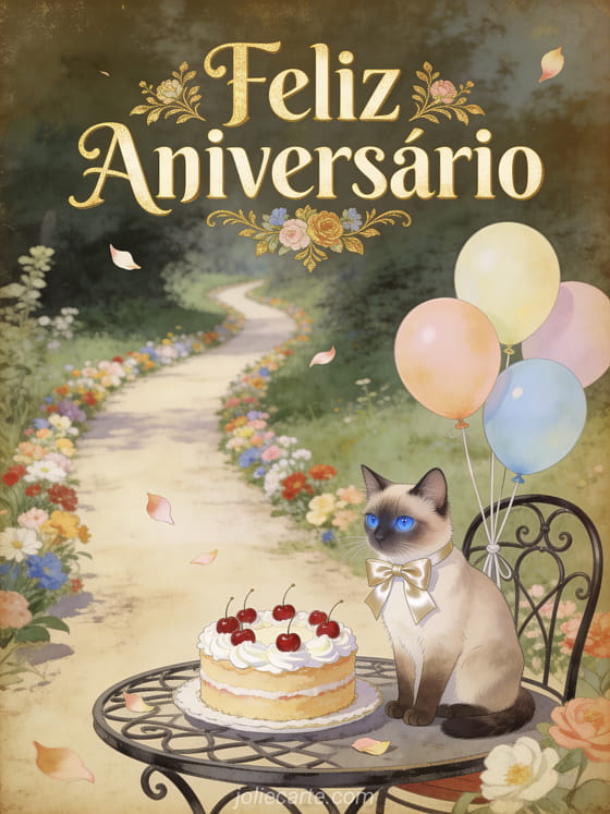 Deseje um feliz aniversário com este elegante cartão estilo vintage com um gato siamês ao lado de um bolo com cerejas em um caminho campestre. Descubra também um cartão de aniversário com champagne ou um cartão divertido de aniversário para ela.